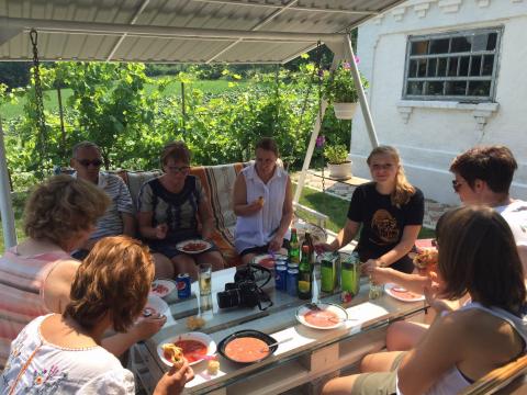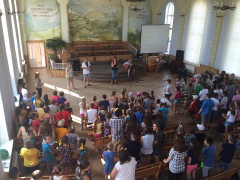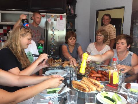Supper was at Oksana and Vitaly's house. They have a beautiful home and three delightful daughters. I think she was under the impression that the entire church had come to Ukraine to visit them this time since the table had an abundance of food we could never have finished. Supper included many tasty dishes, one of which was made from turkey livers. This dish proved to be more than acceptable tasting to me despite my usual aversion to anything containing liver. As good as the food was, the highlight of the evening (and quite possibly the day) was fellowshipping with our fellow believers in Ukraine. Eating, laughing, encouraging, singing, praying. We have brothers and sisters in Christ here in Ukraine that we know very little about. For most of us on the team language is an obstacle, but we have something in common that breaks down all barriers and that is Jesus Christ. This was evident tonight as we got to know Oksana and Vitaly. Len finished our evening off at their home with a prayer for their family and for their work with their local church.